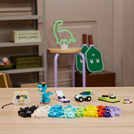 Ustvari kulske predmete za igro in razstavo! Sestavi igralno konzolo, dinozavra z očali, odprt ali zaprt mobilni telefon, komplet za didžeja s slušalkami, rolko, pošastni tovornjak z vrtljivimi kolesi in še veliko več. Modele kombiniraj za še več zabave – na primer slušalke daj na glavo dinozavru, dinozavra pa na rolko!