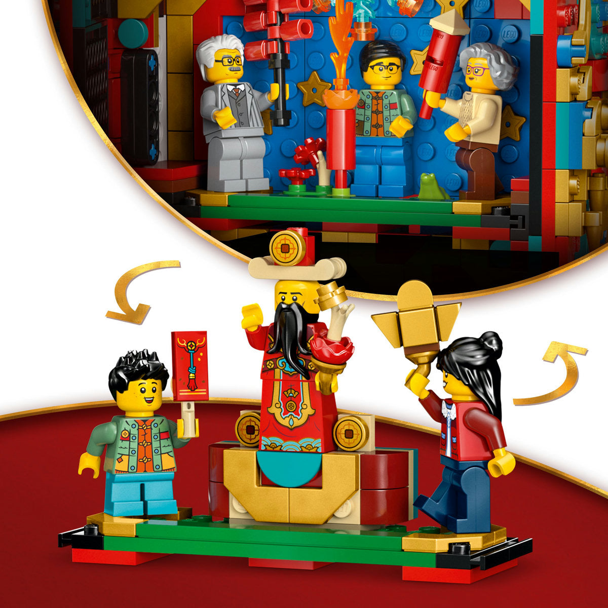 Z igrivim kompletom LEGO® Ognjemet za srečo dodaj še nekaj leska praznovanju pomladnega festivala. Kocke vstavi v tradicionalno oblikovani ognjemet, tako da bo ‚prasketal‘, ko ga premakneš. Neverjetno umetnino obesi na steno, da jo bodo lahko vsi videli. Nato pritisni gumb, da razkriješ svoj izbor: prizor z ognjemetom ali prizor z družinskim obdarovanjem!