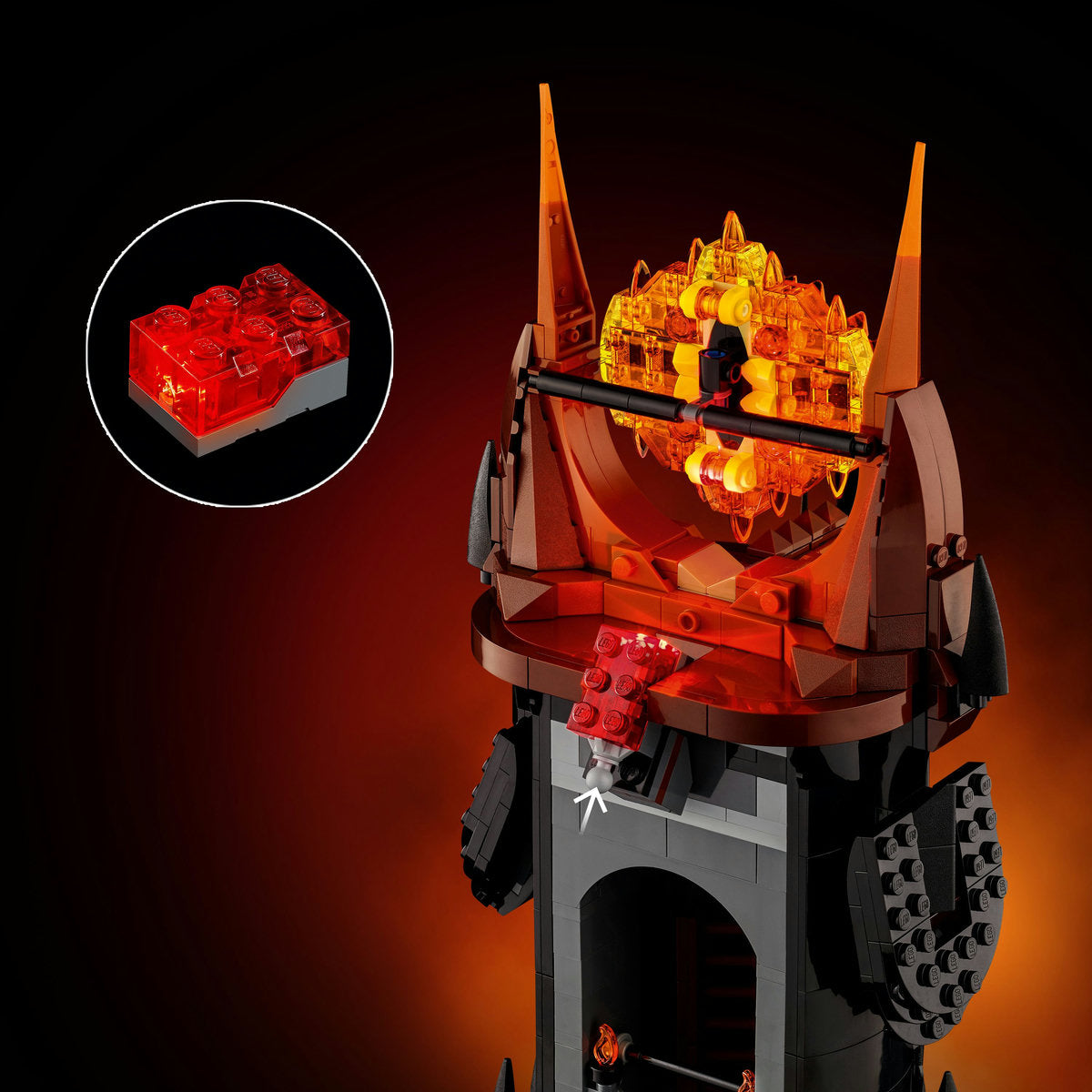 Potovanje v Srednji svet™ z modelom LEGO® Icons Gospodar prstanov: Barad-dûr™. Ta impresiven komplet filmskih spominkov je poln funkcij, ki jih bodo fani oboževali, in prikazuje zloveščo trdnjavo z visokim stolpom, ki dviga Sauronovo oko™ visoko nad Srednji svet™. V kompletu je tudi 10 minifigur, vključno s Sauronom™, Sauronovimi usti™, Gothmogom, Orcom™, Frodom, Samom in Gollumom™. Notranjost 1. nadstropja vključuje Gollumovo skrivališče, kovačnico orožja in zapor z orkovo kletko, ki jo je mogoče dvigniti. Nad jedilnico v 2. nadstropju boste našli sobo s prestolom, ki se odpre in razkrije skriti zemljevid Srednjega sveta. V 4. nadstropju se nahaja Sauronova delovna soba, medtem ko je v 5. nadstropju stolpna knjižnica z vrtečo se lestvijo. Črna vrata so avtomatizirana in Sauronovo oko sveti za očarljiv prikaz. Odkrijte navdihujočo ponudbo kreativnih sestavov LEGO za odrasle. Aplikacija LEGO Builder vsebuje digitalno različico navodil za sestavljanje, ki so priložena temu kompletu.