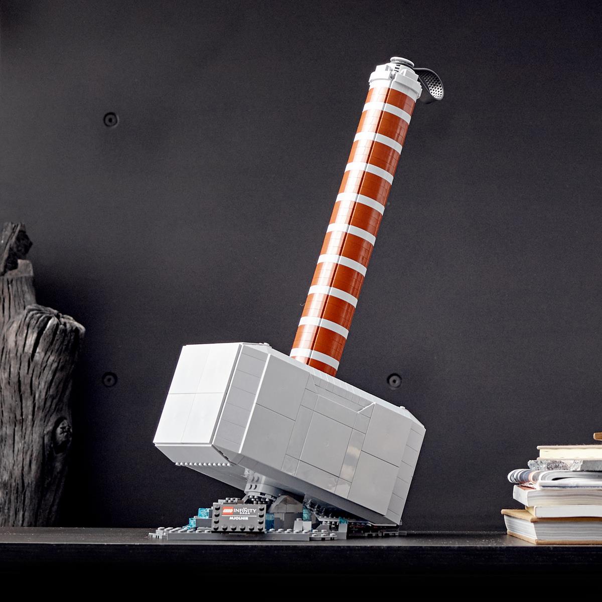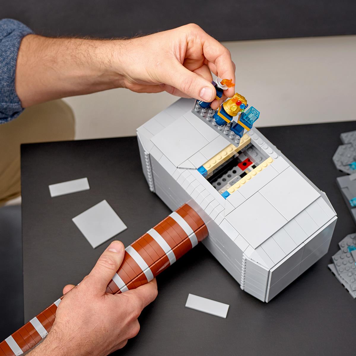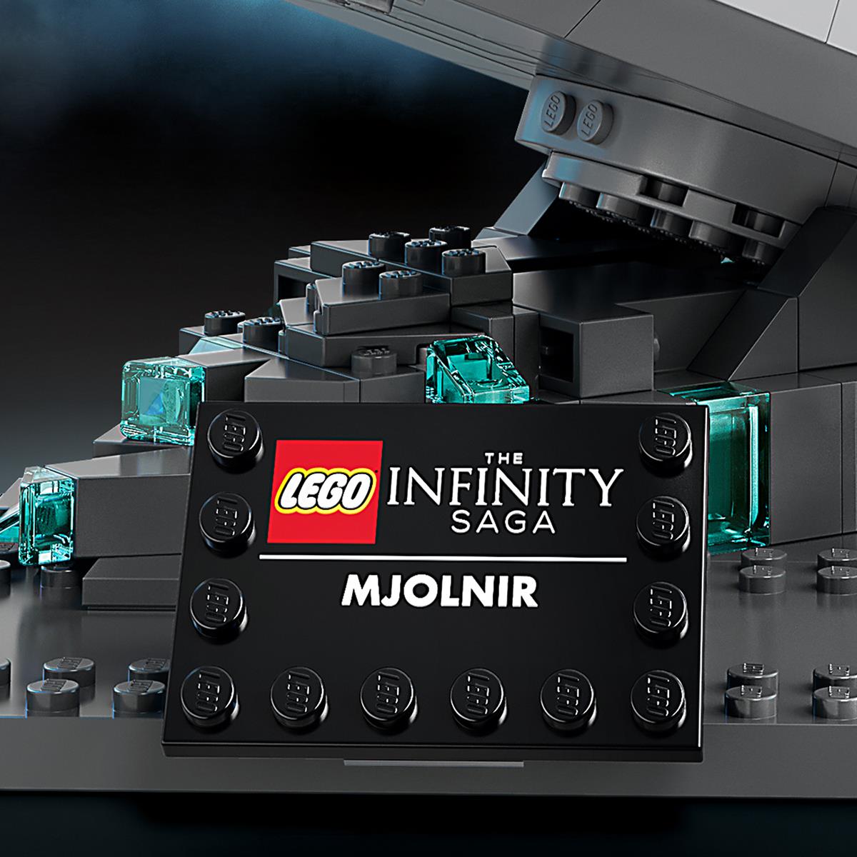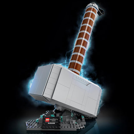 Oglej si slovito Thorovo kladivo. Ljubitelji Marvela bodo takoj prepoznali Mjölnir, čarobno orožje, ki je bilo vedno zelo učinkovito v sagi Neskončnost, 23 filmih Marvel Studios. Z avtentično izdelanim modelom lahko moč Thorovega kladiva vzameš v svoje roke. Poleg modela so v kompletu stojalo, ploščica z logotipom, minifigura Thora ter majhni modelčki rokavice neskončnosti, teserakta in Odinovega ognja.