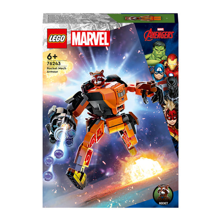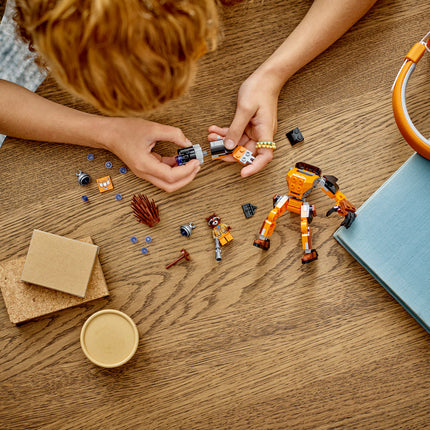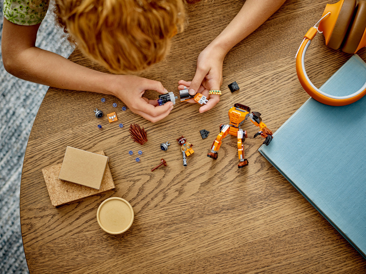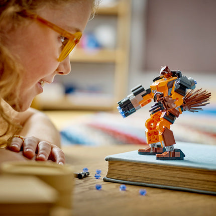Rocketa posedi v pilotsko kabino njegovega rakunjega robota in zvezdo Marvel Studios Varuhi galaksije spremeni v velikana, pripravljenega na spopad! Premakni robotove noge, roke in prste in Rocketa vključi v naslednjo razburljivo nalogo. Oborožen je z velikanskim izstreljevalnikom na 6 žebljičkov, tako da je osupljivi rakun nepremagljiv!