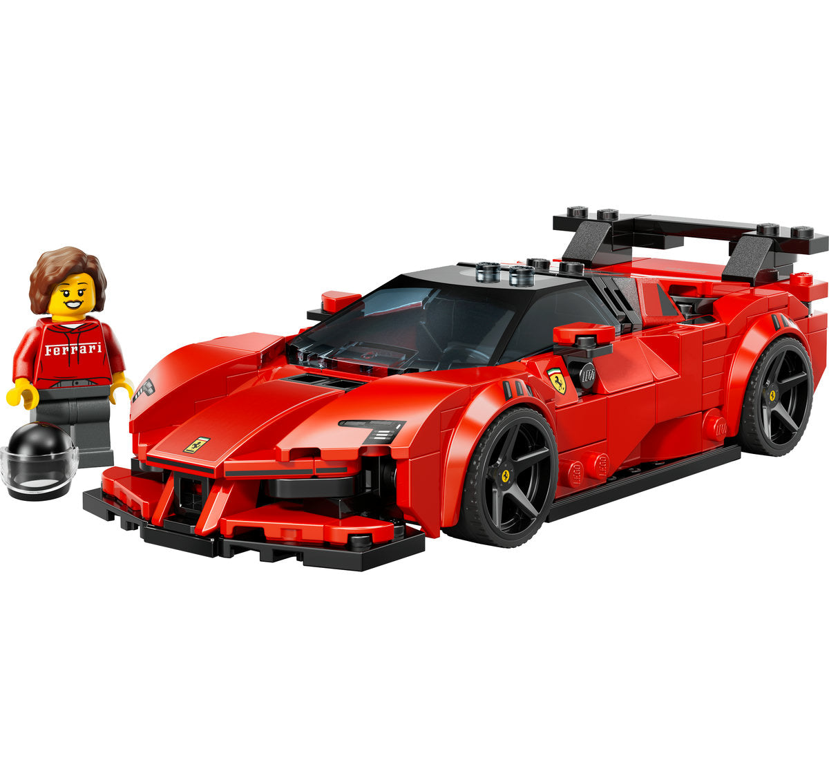 Modelček dirkalnika Ferrari ima naprej pomaknjeno vozniško kabino, zadnje krilce, visoke izpušne cevi in platišča, okrašena s Ferrarijevim emblemom. V kompletu za sestavljanje razstavnega modela avtomobila, s katerimi bodo otroci izkazali svoje navdušenje nad italijanskim proizvajalcem prestižnih avtomobilov, je tudi minifigura voznice v uniformi Ferrari s čelado, ki jo bodo posedli v enosedežno kabino.